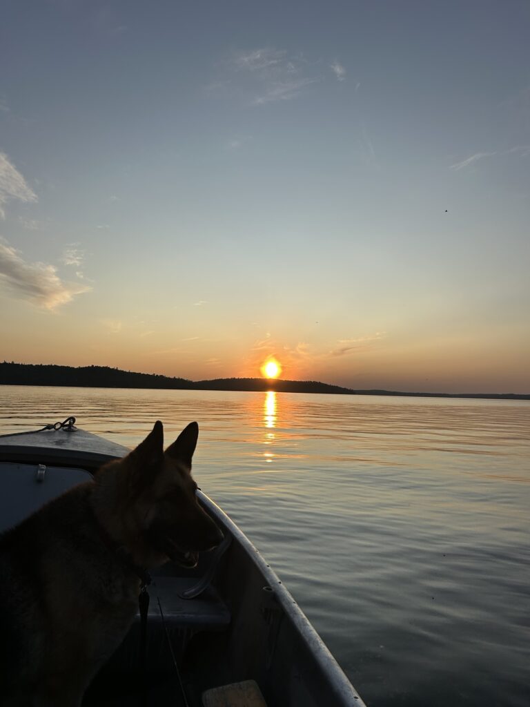 Gracie and I headed back early from fishing and I decided to have a fire despite the mosquitoes. The sunset was fabulous and next to the fire the bugs were tolerable. I didn’t have much firewood so I had to call it an early night once the bugs got worse. My final night in the cabin was uneventful and quiet. But I hadn’t forgotten about the unidentified sounds from the night before and my knives were close by!